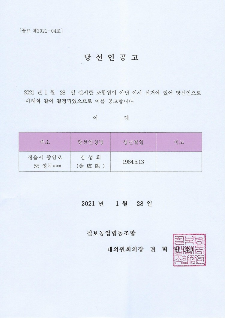 조합원이 아닌 이사(사외이사) 당선인 공고 페이지 정보 작성자 칠보농협 작성일21-01-28 15:05 조회3,672회 댓글0건 관련링크 이전글 다음글 목록 본문 2021.1.28. 실시된 조합원이 아닌 이사(사외이사)선거에 있어 붙임과 같이 당선인이 결정되었기에공고합니다. 붙 임 : 당선인 공고 1부 끝. 댓글목록 등록된 댓글이 없습니다. 이전글 다음글 목록